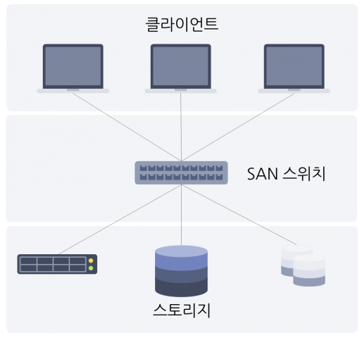 즉, 여러 스토리지들을 하나의 네트워크에 연결시킨 후 해당 네트워크를 스토리지 전용 네트워크로 구성하는 방식이다.